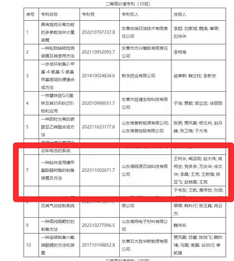 根據(jù)《東營(yíng)市支持專(zhuān)利創(chuàng)造辦法》(東政辦字〔2022〕10號(hào))規(guī)定,2024年度東營(yíng)市高價(jià)值專(zhuān)利擬扶持項(xiàng)目已經(jīng)完成公示,其中重大高價(jià)值專(zhuān)利1項(xiàng),一等高價(jià)值專(zhuān)利5項(xiàng),二等高價(jià)值專(zhuān)利10項(xiàng),三等高價(jià)值專(zhuān)利20項(xiàng)。我公司申請(qǐng)的《一種鉆井液用磺甲基酚醛樹(shù)脂的制備裝置及方法》專(zhuān)利獲得二等獎(jiǎng)。
